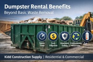 When projects create waste, having the right disposal solution makes all the difference. Dumpster rental benefits support safer, cleaner, and more efficient outcomes without unnecessary stress. Contact Kidd Construction Supply to secure dependable rental solutions designed to keep your project moving forward with confidence.